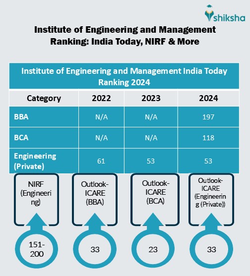 Institute of Engineering and Management is ranked across multiple categories by various eminent national ranking bodies, including NIRF, Outlook, India Today, Business Today, Times, etc. These ranking bodies have awarded Institute of Engineering and Management good ranks. Students can check the following table to learn more about the Institute of Engineering and Management rankings: