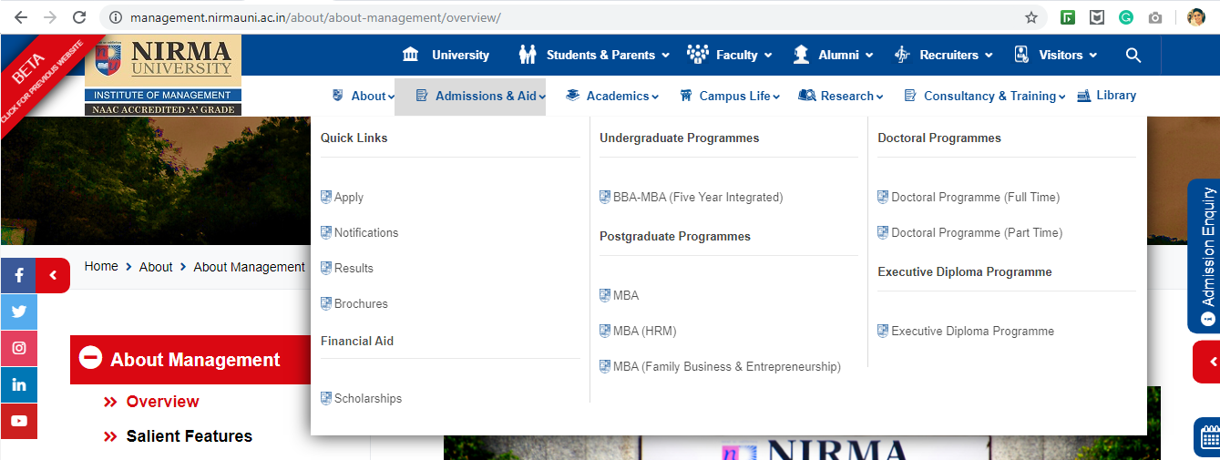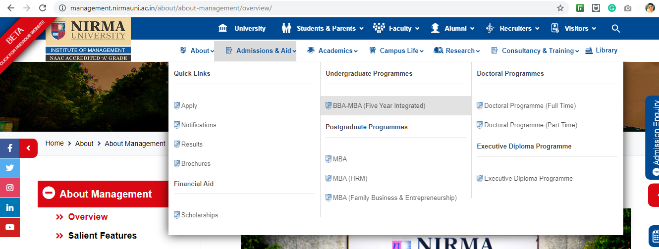 The applicants of BBA-MBA at Institute of Management under Gujarat state quota must fulfil the prescribed criteria. Applicants should be Class 12 or equivalent qualifying exam pass from the schools located in the state of Gujarat with a minimum of 90% aggregate. It is also necessary that the aspiran