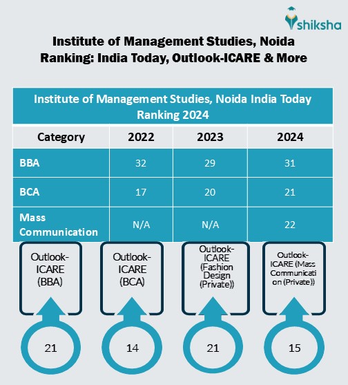Consistently performing well in national rankings, Institute of Management Studies, Noida is recognized by leading rankings entities, including India Today, Outlook-ICARE, Business Today, Times, etc. across various categories. These rankings showcase the institution's achievements over the years. For further details on Institute of Management Studies, Noida rankings, go through the details provided below.