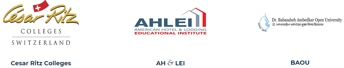 A. Jindal School of Hotel Management has partnerships with three educational institutes, including César Ritz Colleges, Switzerland, Dr Baba Saheb Ambedkar Open University, Gujarat and American Hotel & Lodging Educational Institute (AHLEI), USA.