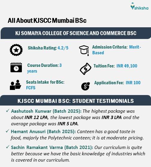 Yes, KJ Somaiya College of Science and Commerce does offers BSc course. The programme is offered as an undergraduate programme lasting for three years. The programme is offered across mutiple specialisations including Biochemistry, Botany, Chemistry, Geology, Mathematics, Zoology, Physics, Statistics, etc. KJ Somaiya BSc admission is the merit-based performance of candidates in the previous qualifying exams. Aspiring students are required to fulfill the minimum eligibility criteria to get admission.
