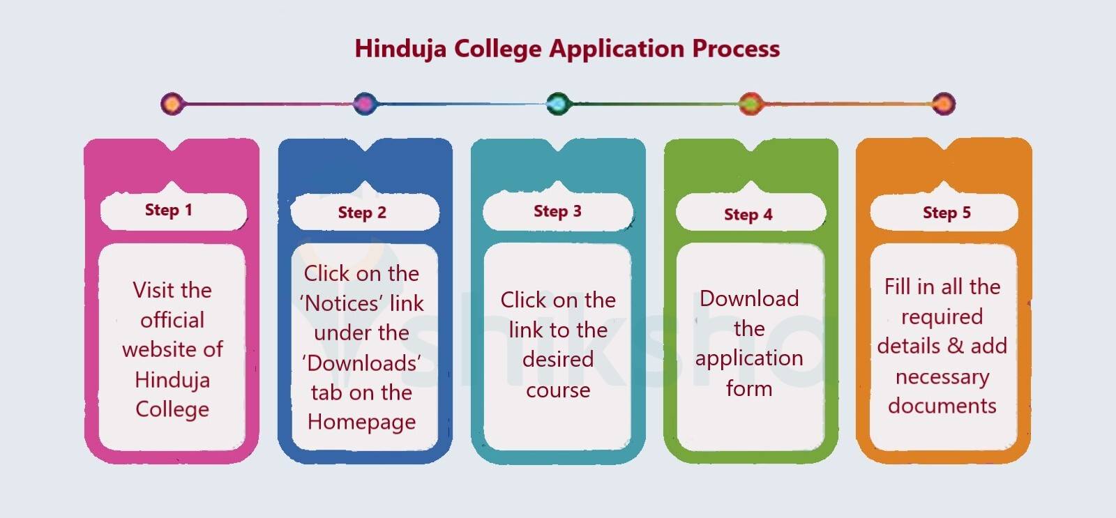 Candidates seeking admission to the desired course at Hinduja College must meet the basic eligibility set by the University of Mumbai. Further, they need to submit the application form via offline mode to be considered for admission. The application fee is Rs 100. The infographic below demonstrates the step-wise Hinduja College admission process 2021: