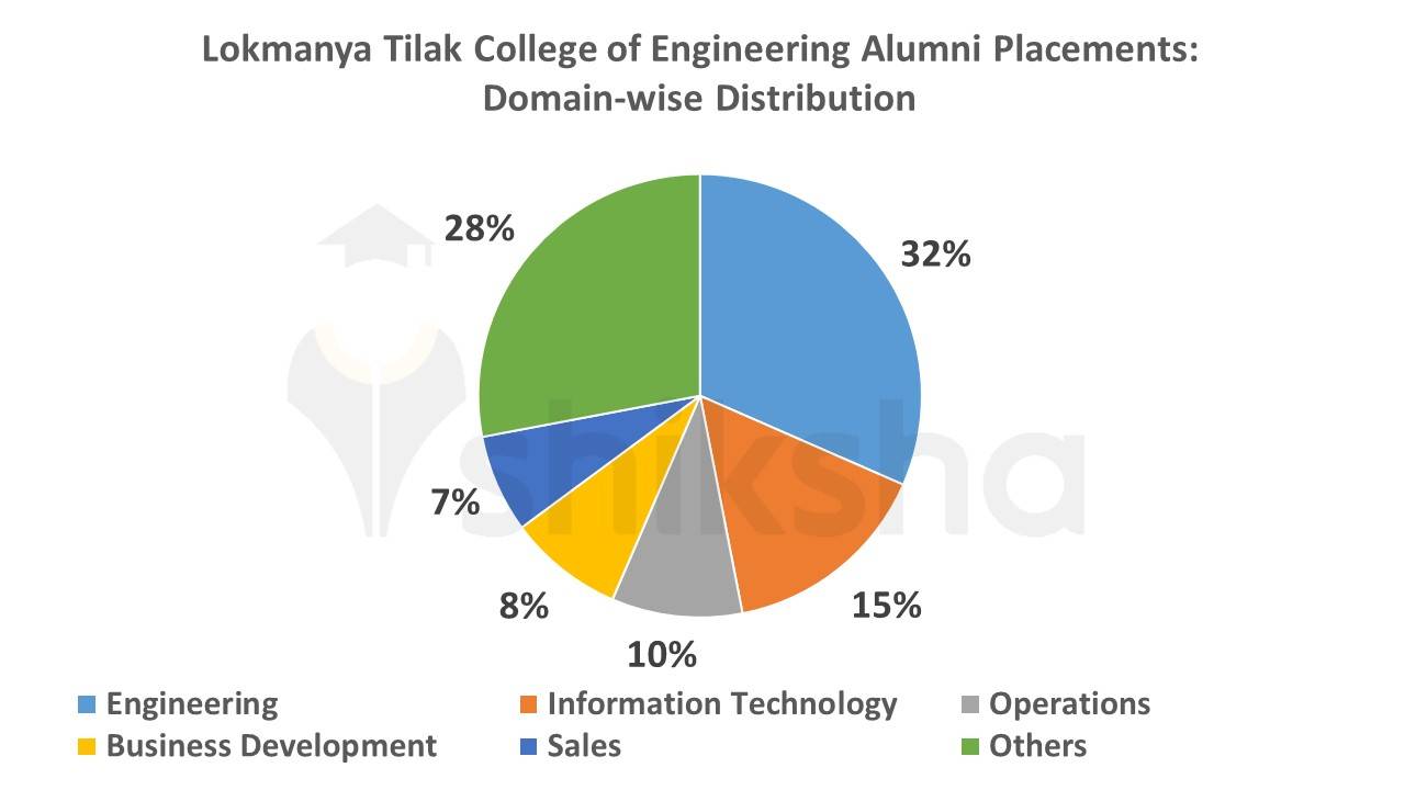 Lokmanya Tilak College of Engineering alumni are placed in leading companies such as Capgemini, Tata Consultancy Services, Accenture, Infosys and L&T Infotech. The domain in which the highest number of alumni are working is Engineering, followed by IT. The domain-wise distribution of Lokmanya Tilak College of Engineering Alumni is represented in the pie-chart below: