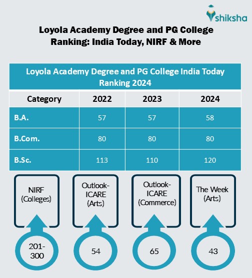 It is to be noticed that the institute has shown a fluctuating trend in the 'B.Sc.' category as compared to the ranking of preceding years. In 2024, Loyola Academy Degree and PG College fell 10 ranks to #120 rank in the 'B.Sc.' category by the India Today ranking.
