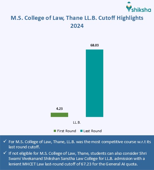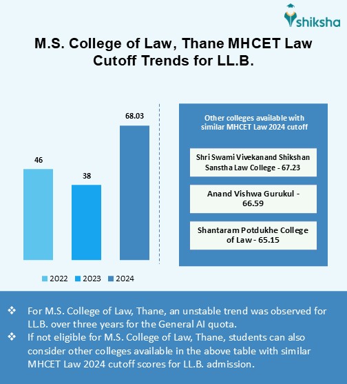 Combined intake across all courses at M.S. College of Law, Thane is up to 126. M.S. College of Law, Thane offers Degree courses including 2 UG course. These programs are offerred in Full Time mode.