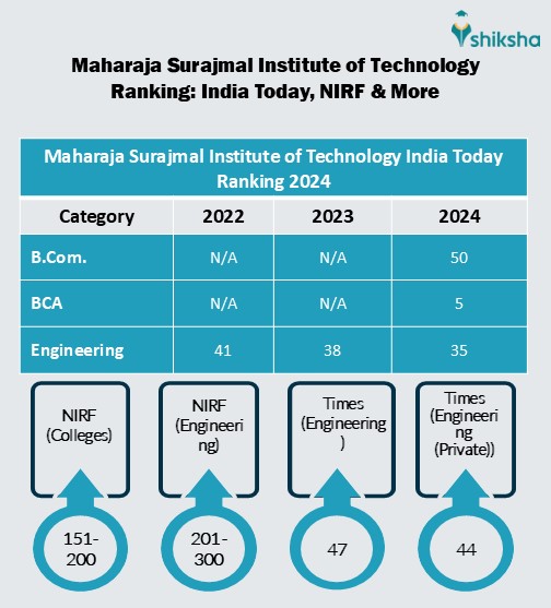 Maharaja Surajmal Institute of Technology has earned a reputation as a top institution, consistently ranked in various categories by national bodies, including NIRF, India Today, Times, etc. These rankings highlight the university's excellence across diverse academic areas. For more details on Maharaja Surajmal Institute of Technology's rankings, refer to the table below.