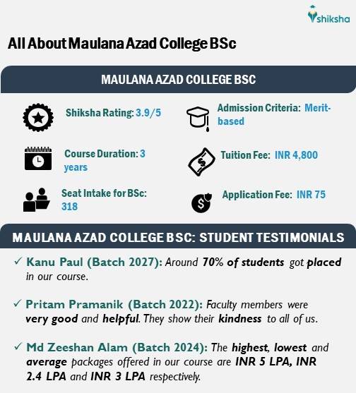 Maulana Azad College offers BSc at UG level. The BSc overall seat intake is 318, which is divided among the BSc specialisations. Find below the BSc seat bifurcation for the academic year 2024: