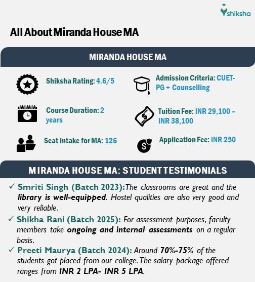 Miranda House MA is a two years course offered across eight specialisations including Music, English, Hindi, Philosophy, Economics, etc. The postgraduate-level course curriculum is available in semester system and spread across four semesters. Find below the Miranda House MA infographics: