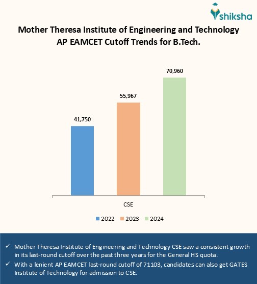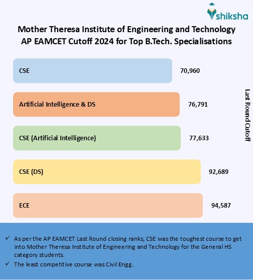 The Andhra Pradesh EAMCET cutoffs for Mother Theresa Institute of Engineering and Technology (MTIET) vary by course and category. For example, in 2023, the closing rank for B.Tech in Civil Engineering (General-All India) was Rank 121,328, while for B.Tech in Computer Science and Engineering, it was
