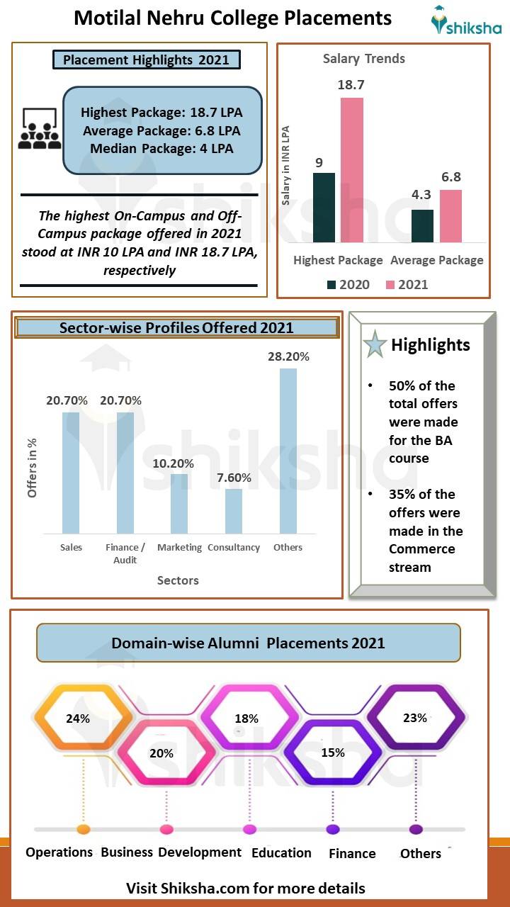 During Motilal Nehru College placements 2021, the median package offered was INR 4 LPA. More highlights from Motilal Nehru College placements 2021 are tabulated below: