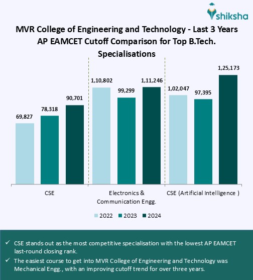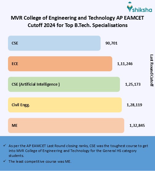 The Andhra Pradesh EAMCET cutoffs for MVR College of Engineering and Technology vary based on the course and year. For example, in 2022, the last round closing rank for General-All India category in B.Tech. in Computer Science and Engineering was 48125. In 2021, the closing rank for the same course