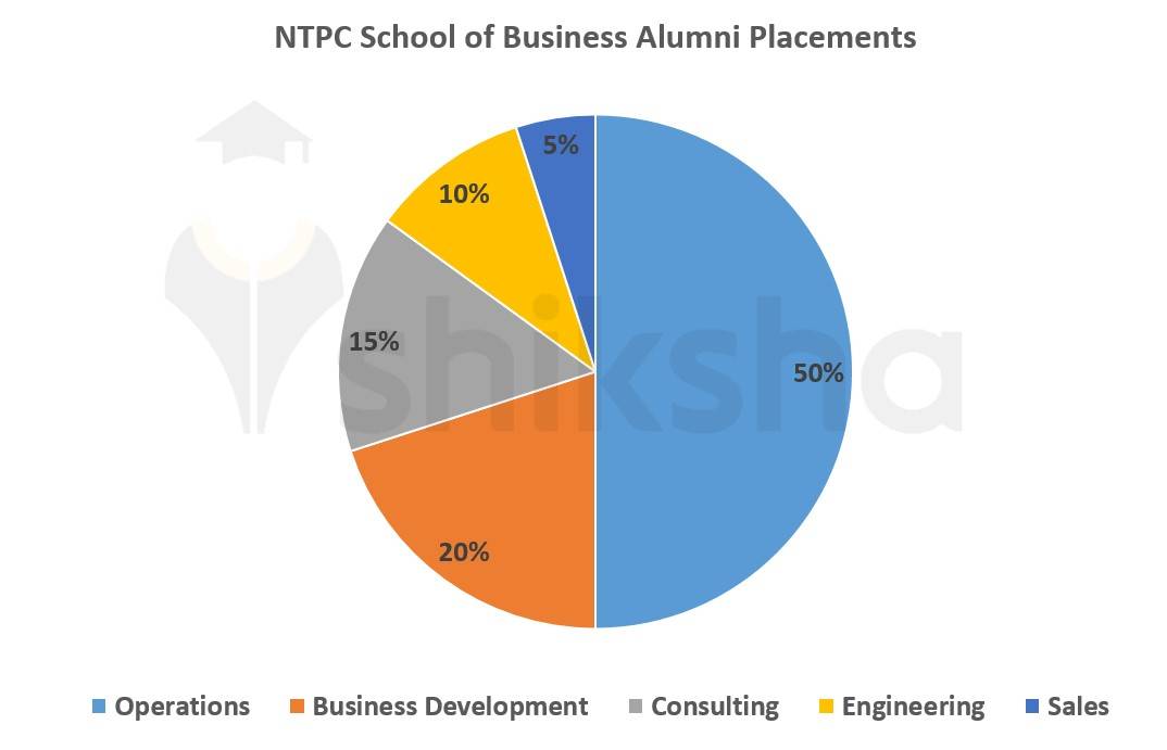 As per the external sources, a major portion of NTPC School of Business alumni are placed in the Operations sector (50%), followed by Business Development (20%) and Consulting (15%). The pie chart below shows a sector-wise bifurcation of NTPC School of Business alumni placements throughout the years: