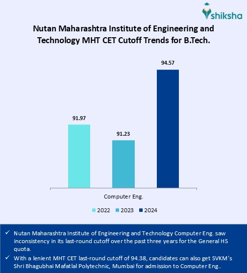 The cutoff ranks for admission to Nutan Maharashtra Institute of Engineering and Technology (NMIET) vary by course and entrance exam. For the 2023-2024 academic year, the MHT CET cutoff ranks for the General category were as follows: