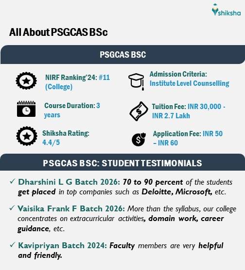 PSG College of Arts and Science BSc course is offered across multiple fields. The UG-level programme is offered in a full-time PSG College mode lasting for three years. Some of the major specialisations are Psychology, Biochemistry, Chemistry, Statistics, Catering Science & Hotel Management, etc. BSc at PSG College is available in both aided and self-financed mode. The below mentioned infographic contains more information about the PSGCAS BSc programme including fees, reviews, seats and more: