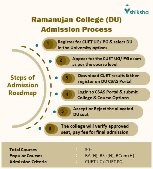 Ramanujan College admission process for UG courses consists of six major steps which include registration for CUET UG, registration for DU CSAS, CSAS counselling process, merit list release and seat allocation. The detailed admission process of Ramanujan College is mentioned below: