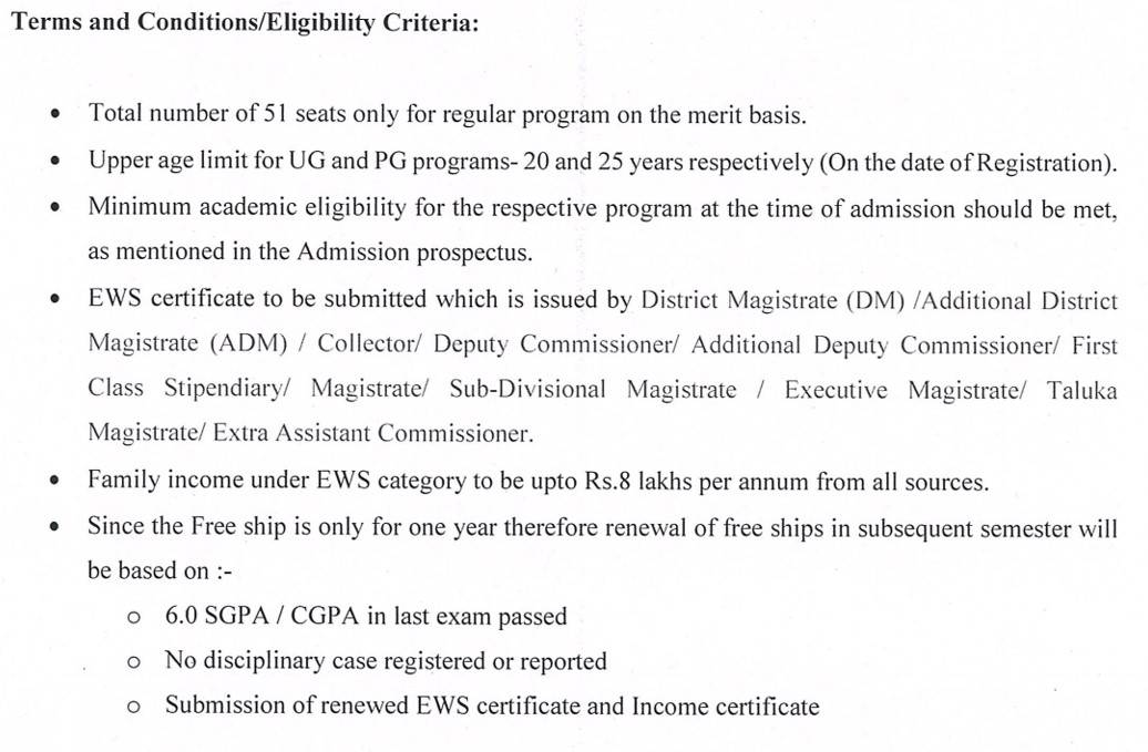 This scholarship is applicable for both UG and PG students and for the second year onwards. The scholarship will be awarded to 10% of the total students enrolled in each of the programmes or 1 student whichever is higher. The 10% will be rounded off to the nearest next number. Here are the criteria:
