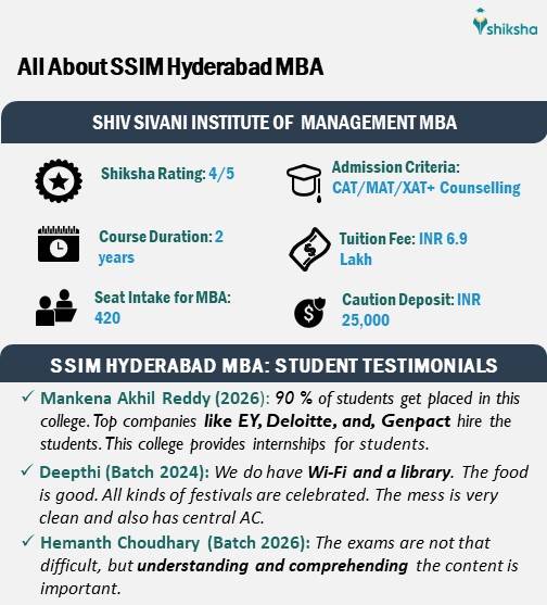 Siva Sivani Institute of Management PGDM is equivalent to an MBA course. The postgraduate-level course is available in PGDM in Business Analytics and PGDM in Banking, Insurance, Finance and Allied Services. Further, the institute also offers PGDM in triple specialisations including Marketing, Finance, HR, Operations Management, Business Analytics, Technology Management & Agribusiness management, etc. The PGDM course offered at SSIM is approved by AICTE and is accredited by the NBA. As a part of the curriculum, the Institute provides international exposure to its students by arranging international study tours and internships. Find more informamtion from the MBA infographics below: