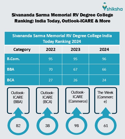 It is to be noted that the institute has demonstrated a fluctuating trend in the 'BCA' category as compared to the ranking of preceding years. In 2024, Sivananda Sarma Memorial RV Degree College climbed 1 rank to #38 rank in the 'BCA' category by the Outlook-ICARE ranking.