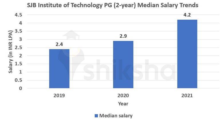An improving trend was observed in the median package offered to PG (2-year) students over the past three years. In 2021, the median salary stood at INR 4.2 LPA, which increased from INR 2.4 LPA in 2019 and INR 2.9 LPA in 2020. The infographic given below depicts the SJB Institute of Technology median package trend for PG (2-year) programmes over the past three years: