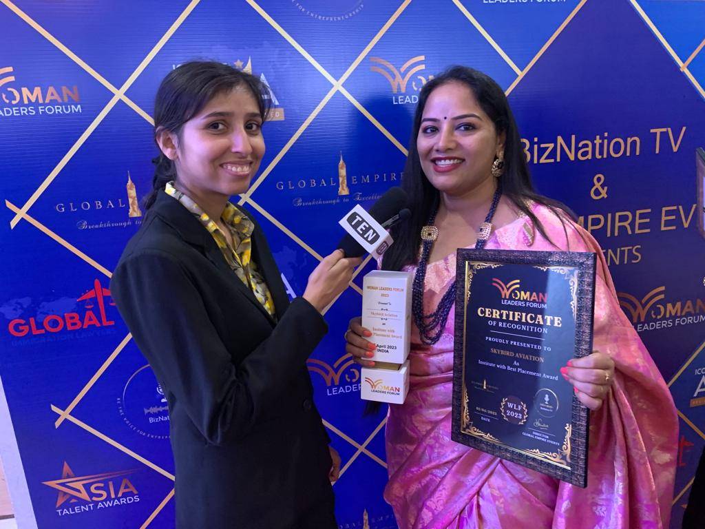 July 12, 2023: Skybird Aviation has won the Best Placements Award from Icons of Asia, Global Empire Events Women's Leaders Forum in collaboration with Biznation TV. Skybird Aviation chairperson Sujatha Bairi accepted the award at a grand ceremony. This award recognizes Skybird Aviation's commitment to providing top-notch placement opportunities to clients.