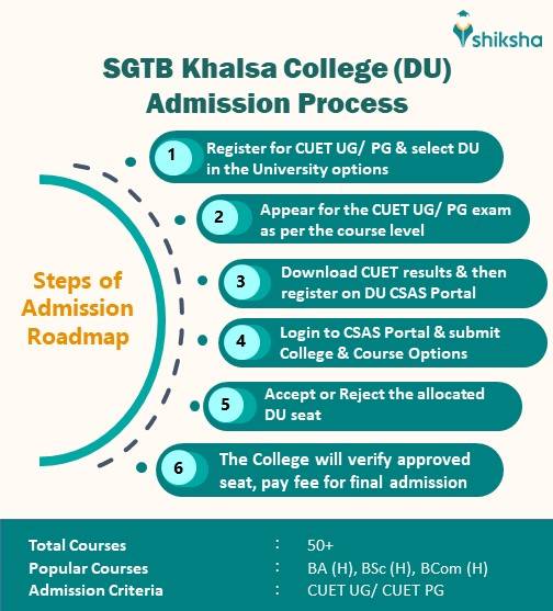 SGTB Khalsa College BA (Hons) admissions are based on the CUET scores. To apply for the BA (Hons) programmes, candidates are required to follow certain process which include appearance in the CUET, registration for DU CSAS, counselling process and seat allocation. Given below is the admission proces