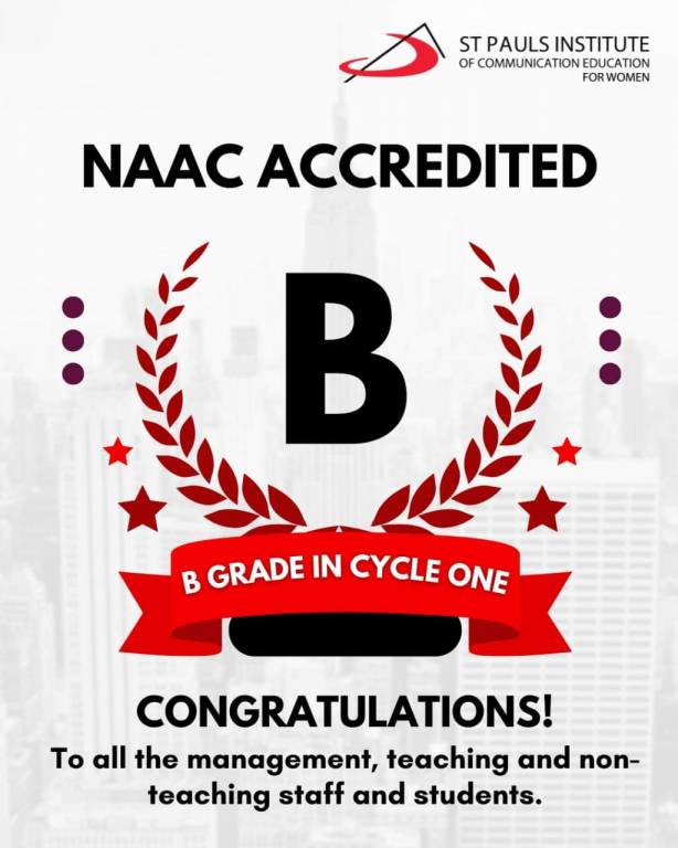 November 6, 2024: St Pauls Institute of Communication Education for Women is proud to announce that the institute has been NAAC Accredited with a CGPA of 2.49 on a 7-point scale at B Grade for a period of 5 years, effective from 18th October 2024. This remarkable achievement in the institute’s First Cycle reflects the dedication, teamwork, and relentless efforts of everyone involved. A heartfelt thanks to the faculty, staff, students, and supporters who have worked tirelessly to make this dream a reality. Their commitment has brought the institute to this incredible point of success.
