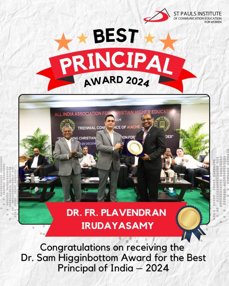 St Pauls Institute of Communication Education for Women iPrincipal, Dr. Plavendran Irudayasamy, has been awarded the prestigious Dr. Sam Higginbottom Award for the Best Principal of India – 2024 by the All India Association for Christian Higher Education (AIACHE), New Delhi