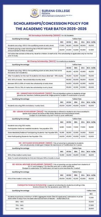 Surana College Peenya Campus admissions are merit-based. Students are selected on the basis of their academic merit in the last qualifying exam. The college offers UG-level programmes in full-time mode. These are offered in fields, such as Science, Commerce, Arts, Computer Applications, and Business Administration. The application process can be completed online or in-person at the college campus.
