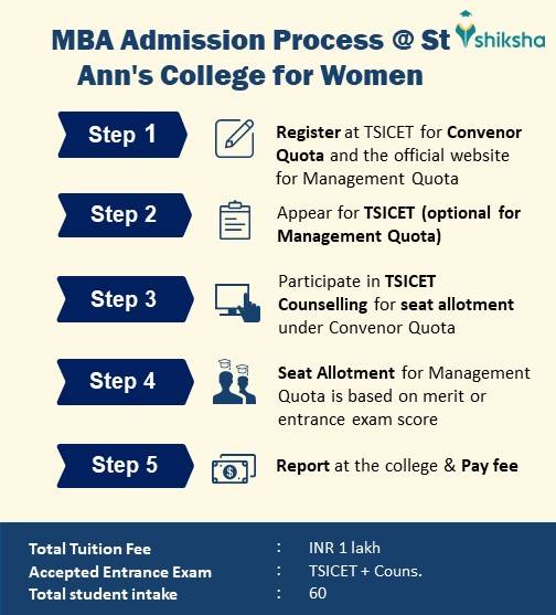 Telangana Mahila Viswavidyalayam MBA admission is entrance-based. The University accepts TSI CET scores to shortlist candidates for admission. The duration of the Telangana Mahila Viswavidyalayam MBA course is two years, spread across 4 semesters. Candidates must have completed graduation in any stream to become eligible to apply for admission. Find below the infographic for the MBA admission process: