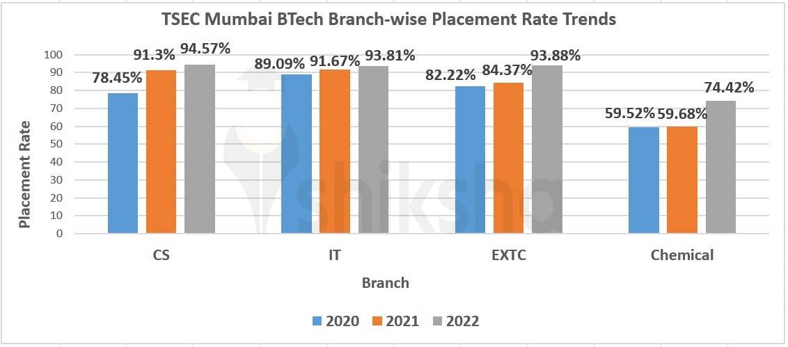 An improving trend was witnessed in the BTech branch-wise placement rate recorded over the last three years during Thadomal Shahani Engineering College placements, which is presented below: