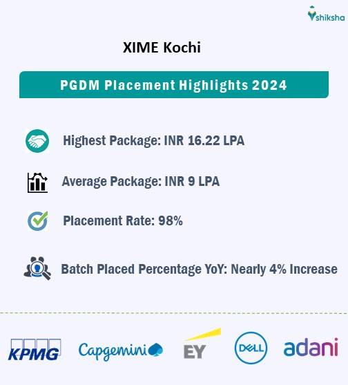 The placement rate recorded during XIME Kochi PGDM placements 2024 was 98%. Further, the highest and average package offered during XIME Kochi placements 2024 for PGDM program stood at INR 16.22 LPA and INR 9 LPA, respectively. The top 50% of the batch received average package of INR 10.5 LPA during PGDM placements 2024.