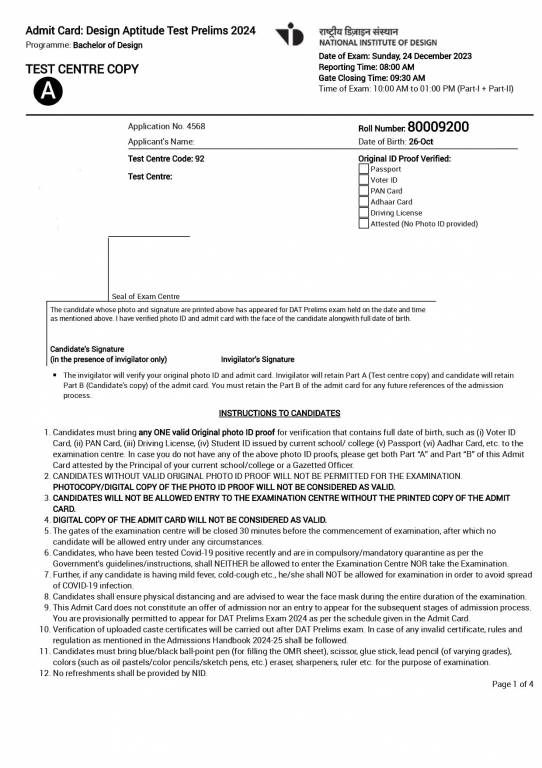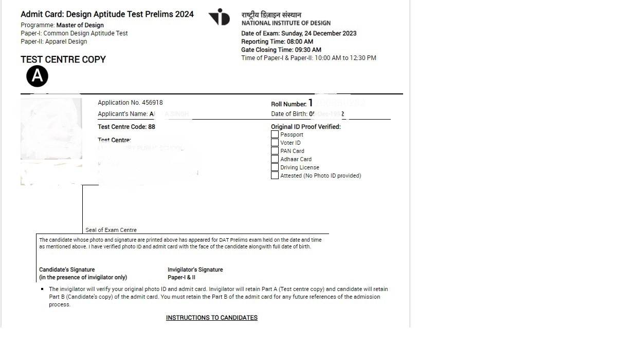 • NID DAT (Prelims) Admit Card - Sample Test Centre Copy