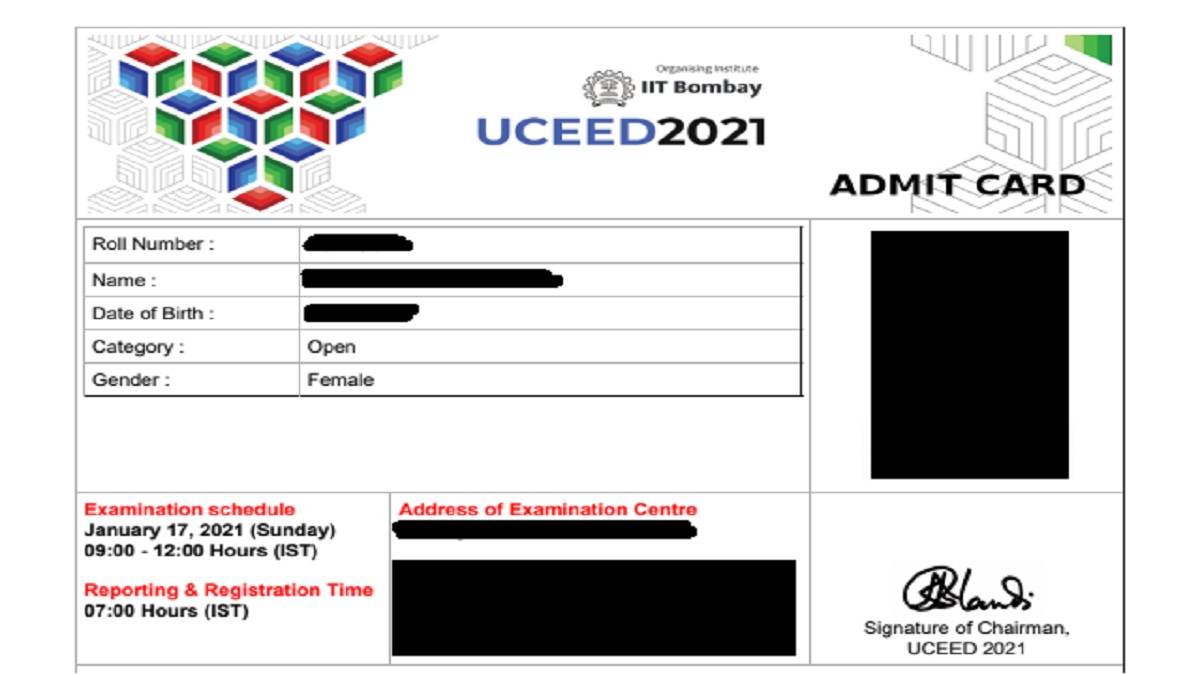 Carefully examine ALL the entries in the UCEED admit card. In case of any discrepancy, the candidate has to contact the UCEED Office at IIT Bombay at the following email address: uceed@iitb.ac.in.