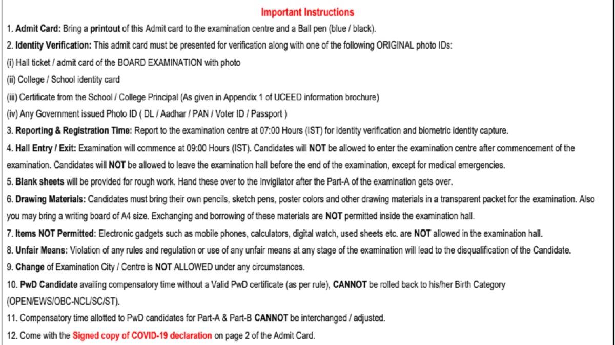 | Reporting Time | Candidates need to report to their UCEED exam center at 7 AM. The admit card and a Valid, Original Photo Identity Proof would be required for recording biometric information (thumb impression and photograph) before appearing for the examination. |