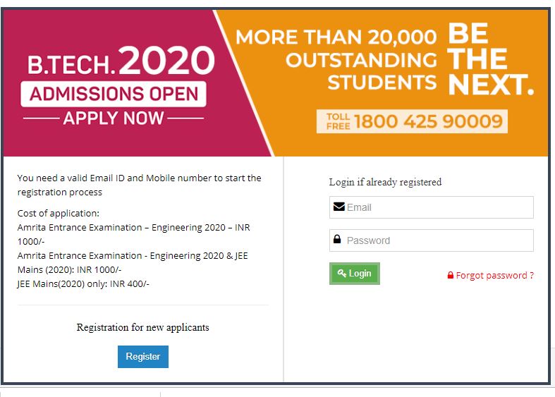 Interested candidates can fill AEEE 2020 application forms online as well offline. To register online, aspirants need to visit the Amrita Online Admissions Portal. Offline application forms for AEEE 2020 can be obtained from the list of sale outlets (Post Office, Dhanlaxmi Bank and Federal Bank). Aspirants can procure the details of the sale outlets from the University Website. The application fee for AEEE 2020 is Rs. 1000 for candidates taking admission through AEEE 2020 while candidates who are applying only through JEE Main 2020 scores will have to pay Rs. 400. Here’s how you can fill AEEE 2020 application forms!