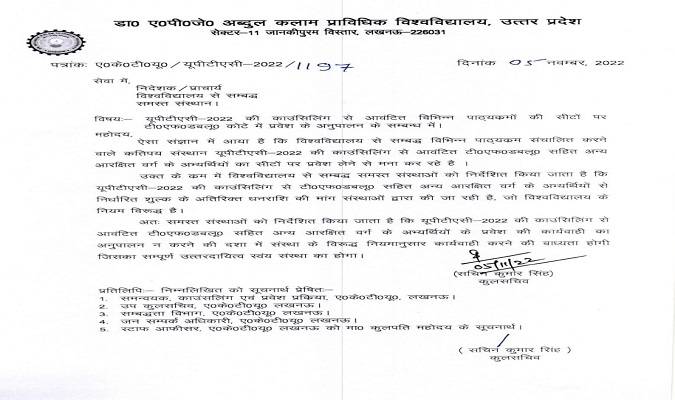 Dr APJ Abdul Kalam Technical University (AKTU) has issued a circular directing institutions affiliated to it to ensure proper compliance of the Tuition Fee Waiver (TFW) scheme while admitting students through Uttar Pradesh Technical Admission counselling (UPTAC).