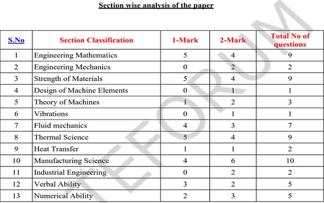 (a) Forenoon Slot: There were good no.of questions from Strength of Materials, Thermodynamics &Fluid Mechanics, but substantial weightage was given to Manufacturing Technology. Questions from Design Part were moderate in number as well as the complexity.Level of questions in Engg. Maths & Aptitude was easy and most of the questions could be easily answered.