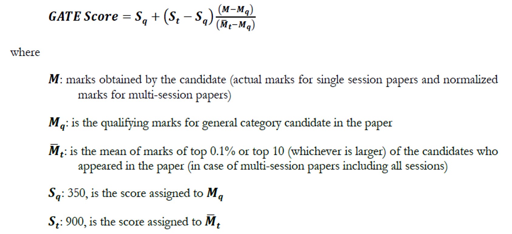 For papers conducted in multiple sessions: For papers in multi-session, the GATE 2025 Score will be calculated based on the normalised marks. For all candidates (including single and multiple sessions) GATE Score will be calculated using the below formula: