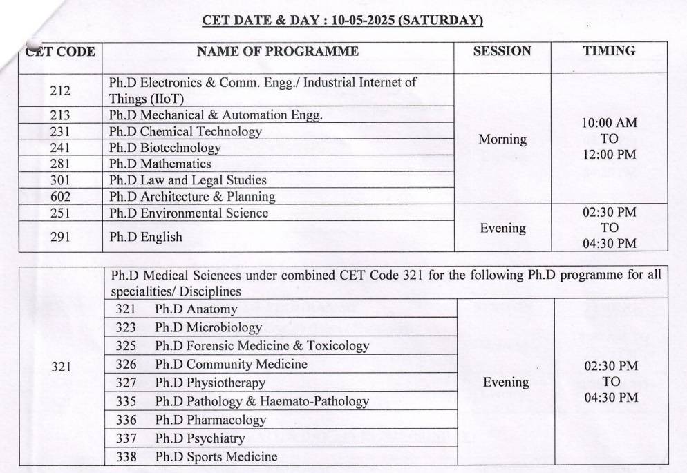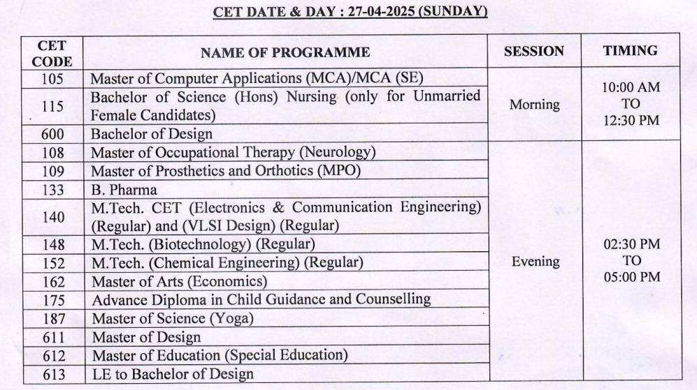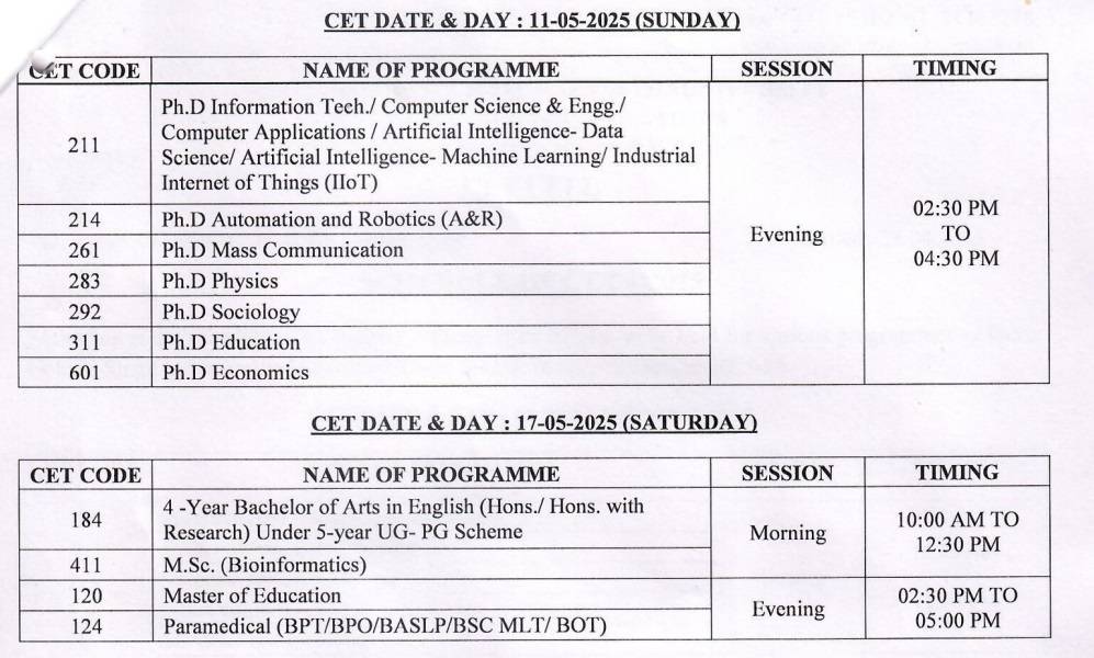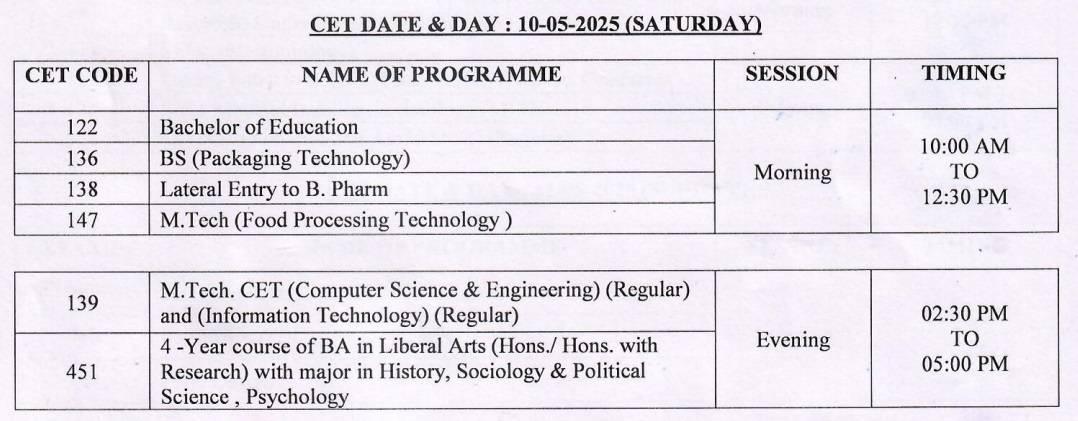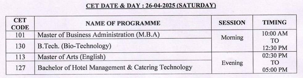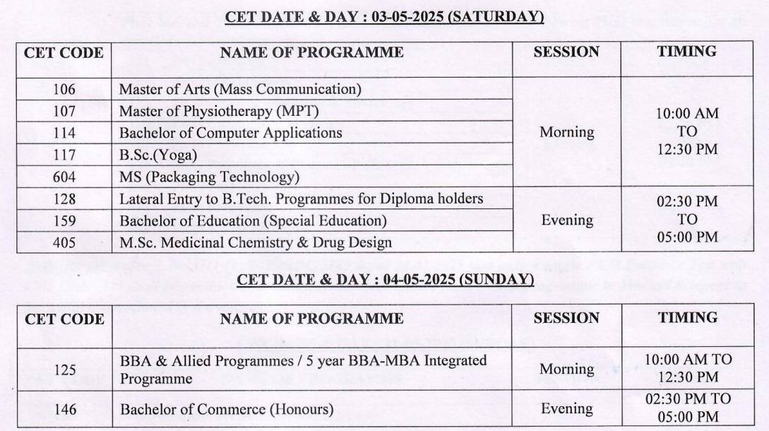 The CET schedule is given below.