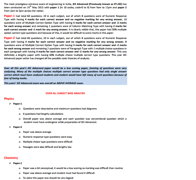 Students can go through the detailed JEE Advanced 2015 exam analysis by Career Point Kota below: