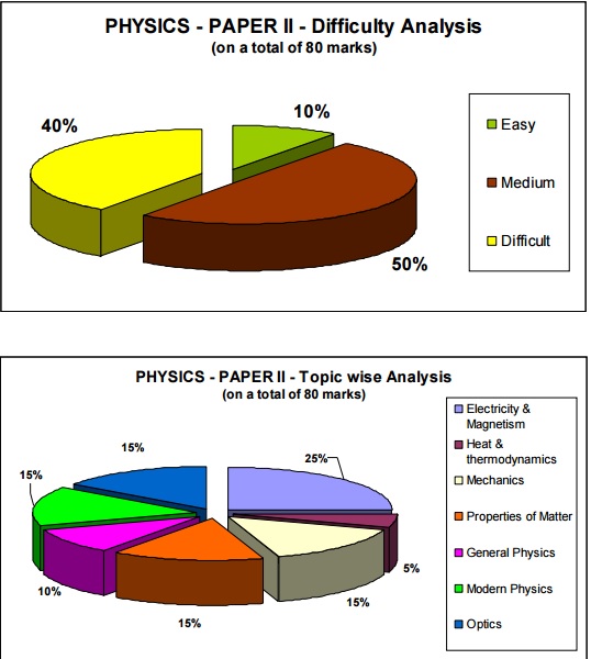 Paper 2 also has the general characteristics of paper 1. Many of the questions are more inclined toward the math skill of the student rather than testing the conceptual clarity in Physics. Both the papers put together is rated to be difficult even for an above average student. The difficulty analysis and the topic wise analysis are shown below: