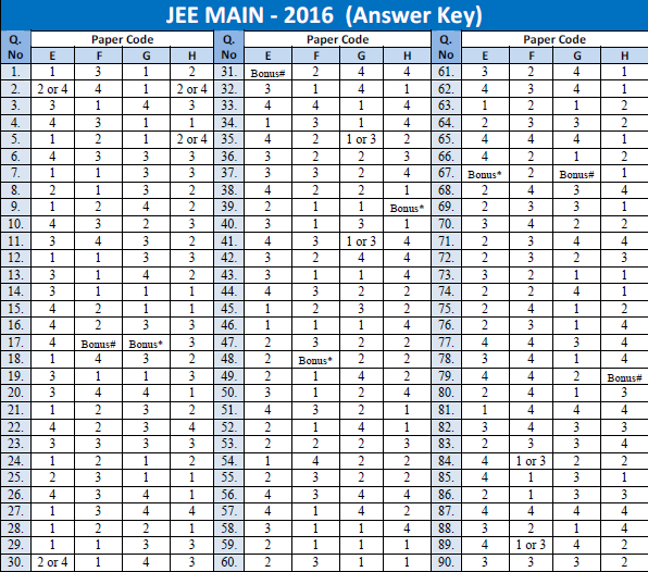 Check the JEE Main 2016 answer key by Career Point, for question paper E,F,G, and H: