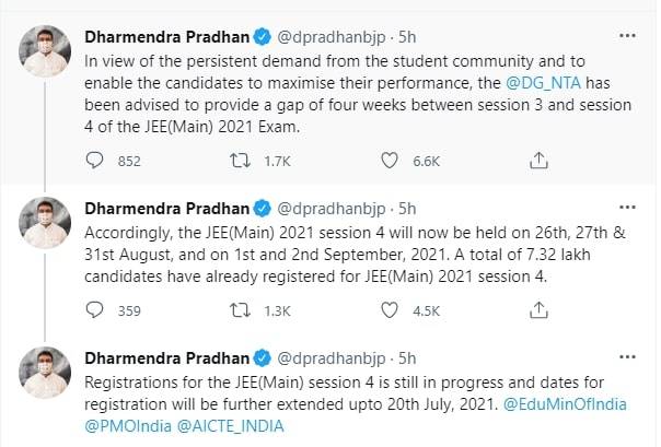 NTA has postponed JEE Main 4th attempt date and exam will now be held on August 26, 27, 31 and September 1, 2. Last date to fill session 4 application form has also been extended till July 20.