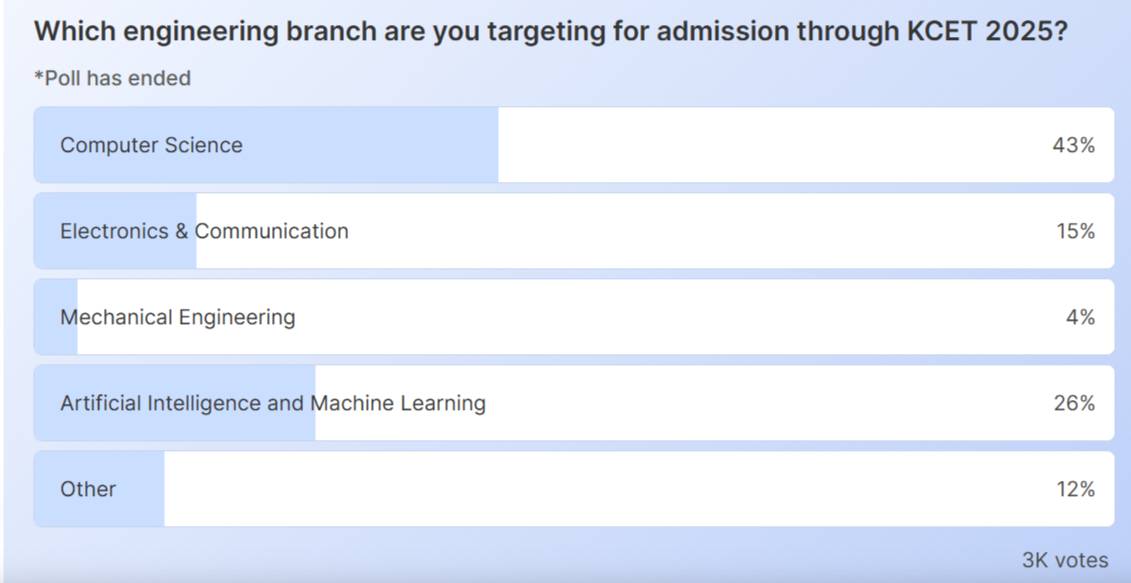 The recent poll by Shiksha titled “Which engineering branch are you targeting for admission through KCET 2025?”, saw close to 3000 students express a strong tilt towards Computer Science and Artificial Intelligence-related branches.