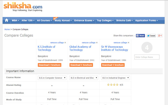 In the college predictor tool, you can also download brochure for any college that you like. Apart from this, you can also compare a total of four colleges that are displayed in the list for you. When you add colleges for compare then a separate page opens up which provides you information about all the selected colleges under headers such as – Course Name, Alumni Rating, Course Duration, Affiliations, Top Recruiting Companies, Fee, Eligibility, Hostel, Transport Facility, Wifi Campus and Free Training.