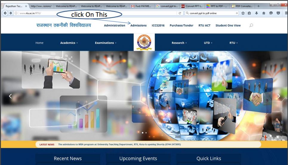 1. Visit the official website of Rajasthan Technical University and click on admissions as shown in the image.
