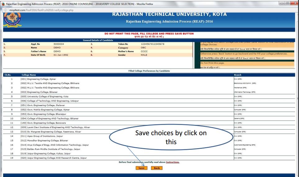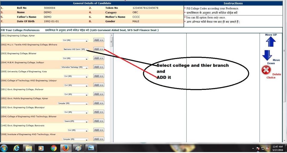 After submitting the application form, candidates need to click on “Fill Option Form” to fill the college choices available in the list. To login for Fill College Choices, one needs to submit his/her Application/Challan No, JEE Main 2016 Roll No, Token Number/Transaction ID, and Date of Birth, and Click “Login.”