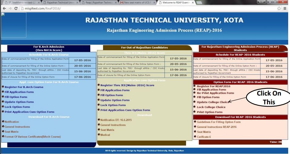 Till last year, admissions to engineering colleges in Rajasthan were done through a written test known as Rajasthan Pre Engineering Test (RPET). From this year onwards, the admissions will be done on the basis of REAP, which is an online application form process, where admissions will be done through counselling. RPET has been abandoned for the same reason. The admission process of REAP includes four stages- Stage I Online Registration, Stage II Choice Filling and Locking, Stage III Seat Allotment Procedure, and Stage IV Physical Reporting and Admission.