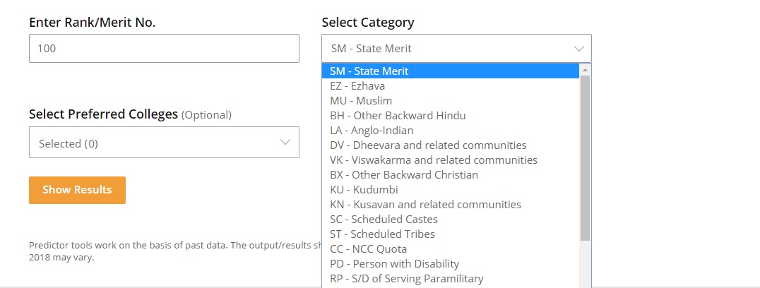 Please note that the KEAM 2018 College Predictor tools work on the basis of past data. The output/results should be used purely for reference purposes. Actual result of 2018 may vary. The data is based on the admissions data of KEAM 2017.