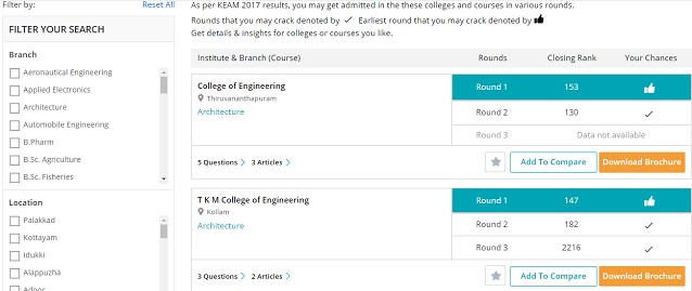 To help such candidates, Shiksha has launched the KEAM College Predictor Tool. This college predictor tool helps aspirants find out the college as well as engineering branch in which they can get admission in Kerala on the basis of their KEAM ranks and score. Apart from this, the tool offers information to aspirants regarding the closing ranks for admissions in different colleges which accept KEAM 2018 scores. Candidates can also seek information regarding which colleges will offer them admissions in the engineering branch/branches of their choice.